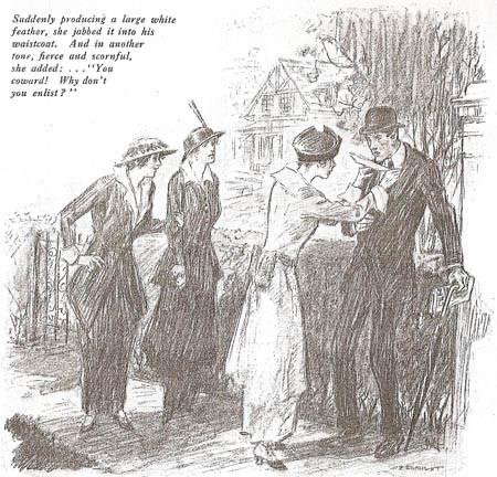 Suffragette ‘White Feather Women’ propaganda depiction reads ‘Suddenly producing a large white feather, she jabbed it into his waistcoat. And in another tone, fierce and scornful she added:.. “You coward! Why don’t you enlist?”