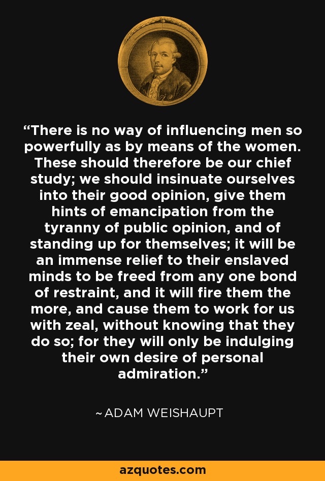 “There is no way of influencing men so powerfully as by means of the women. Women therefore, should be our chief study. We should ingratiate ourselves into their good opinion, give them hints of emancipation from the tyranny of public opinion, and of standing up for themselves. It will be an immense relief to their enslaved minds to be freed from any one bond of restraint and will fire them the more, causing them to work for us with zeal without knowing that they do so; for they will only be indulging their own desire of personal admiration”. Adam Weishaupt – German cleric & ‘philosopher’ (1748 – 1830)