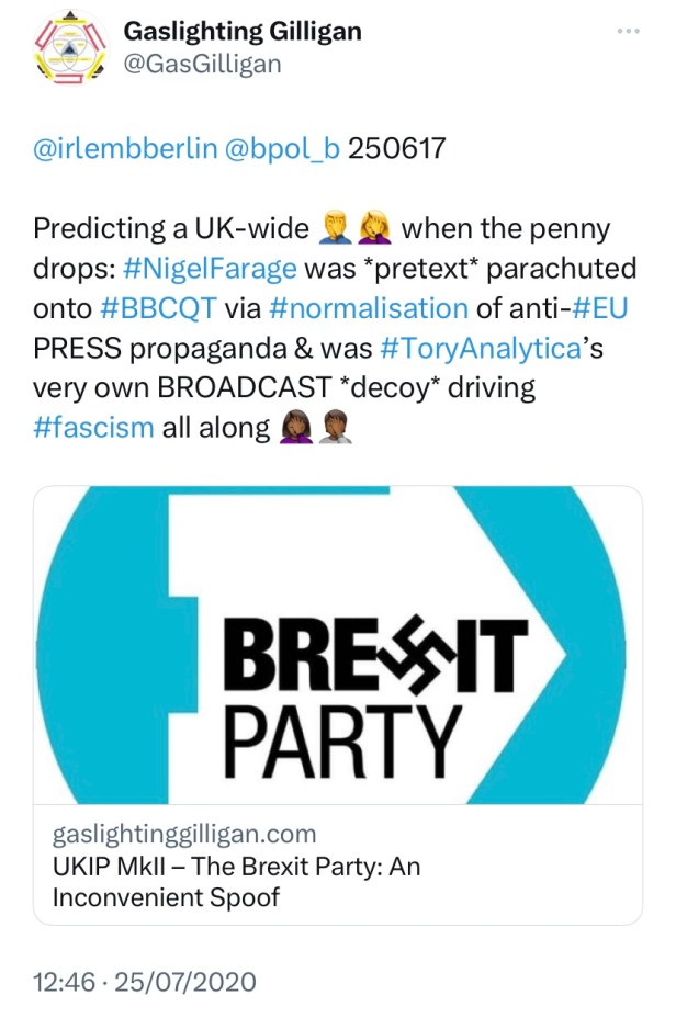 Just to clarify, ‘Gaslighting Gilligan’ is the (free download) book AND blog name. In my blog pieces are most of my interpretations, in which Brexit is merely the tip of the ideological iceberg.