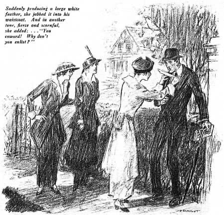 “Suddenly producing a large white feather, she jabbed it into his waistcoat. And in another tone, fierce and scornful she added:…”You coward! Why don’t you enlist?”