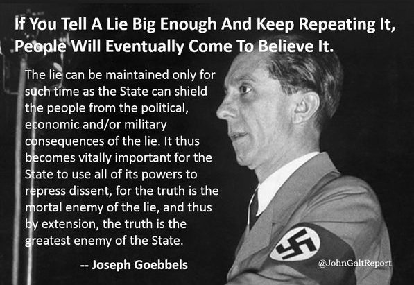 “If you tell a lie big enough and keep repeating it, people will eventually come to believe it. The lie can be maintained only for such time as the State can shield the people from the political, economic and/or military consequences of the lie. It thus becomes vitally important for the State to use all of its powers to repress dissent, for the truth is the mortal enemy of the lie, and thus by extension, the truth is the greatest enemy of the State.” Joseph Goebbels.