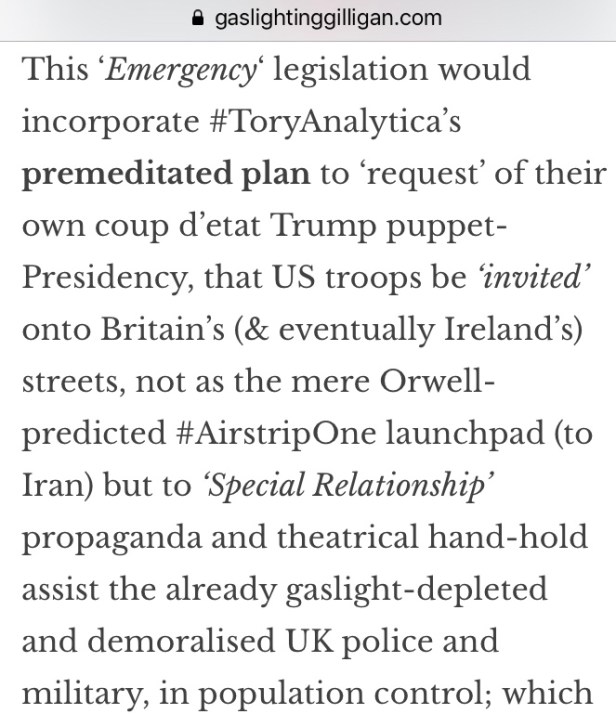 However what the vast majority still haven’t processed is this was Johnson’s ‘in-house joke‘ telling us all how both Brexit and the Trump Presidency were to be militarised and a ‘vengeful’, victimhood-steeped US/UK led global fascism mobilised, to result in a US economic and military gaslight ‘rescue’, complete with American troops and private military contractors deployed in Britain (& Ireland) – aka Orwell’s ‘Airstrip One’. Which is why I straplined ‘Gaslighting Gilligan ‘a paradigm shift in the meaning of domestic abuse and the Atlantic Bridge to ‘1984’.