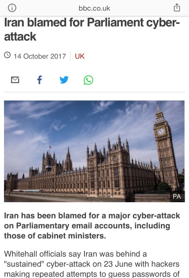 So, just as with Hunterston’s “cracks“, I interpreted in 2017 that we were all being ‘informed’, or psychologically softened-up by ‘inevitability narrative’, via the ‘WannaCry’ global-IT ‘attack’, that in Britain centred on the already embattled NHS‘s outdated Windows XP operating system that May, and then also on Parliament on 23rd June, subsequently pinned on Iran…