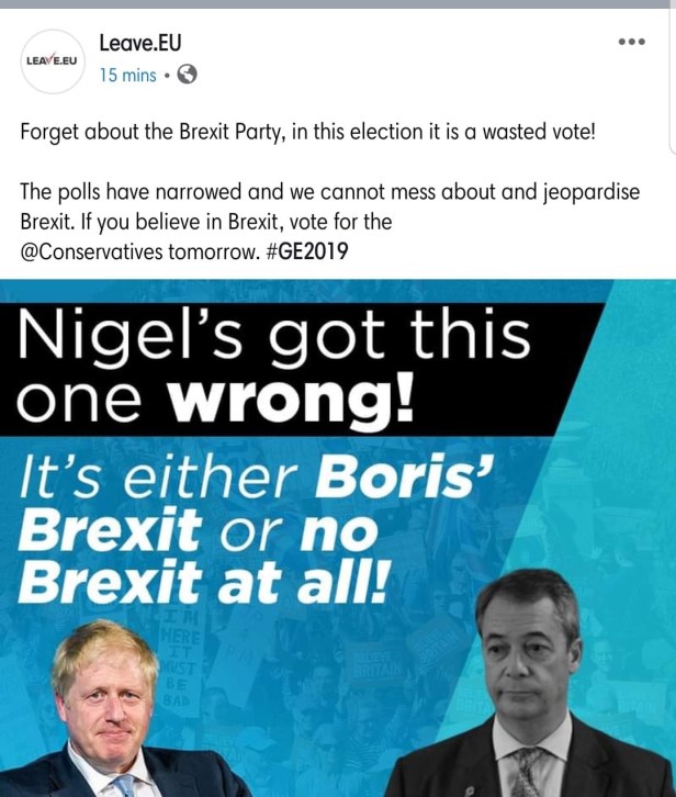 This gaslighting also includes a costly, simultaneously Royal Mail delivered – not activists delivered – deluge of Tory & LibDem campaign literature in Scotland, as well as a Fakebook saturation of a #ToryAnalytica tactical voting campaign to ‘Get Brexit Done’ – all of which combined are selling us the pretext of Tory/Brexit success story and Labour ‘losses’ in order we are all more susceptible and therefore more likely, to readily accept the #TheParty’s predetermined GE2019 outcome as so-called ‘democracy’.