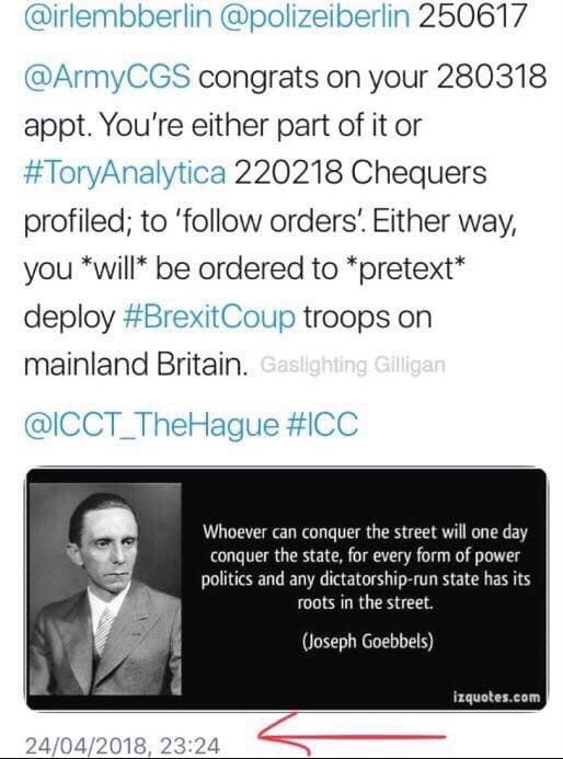 ‘Any ‘democratic’ decision that needs to be enforced or ‘supported’ by a Government deployment of the military, in order it can maintain or secure political power via the streets, ports and infrastructure etc, is in fact in any conventional, consistent, rational-thinking and functioning democracy – a coup d’etat’. ~ ‘Brexit: All Roads to Rome – Militarisation’. #GaslightingGilligan, December 2018 (see also pinned video on my Facebook page).