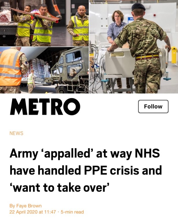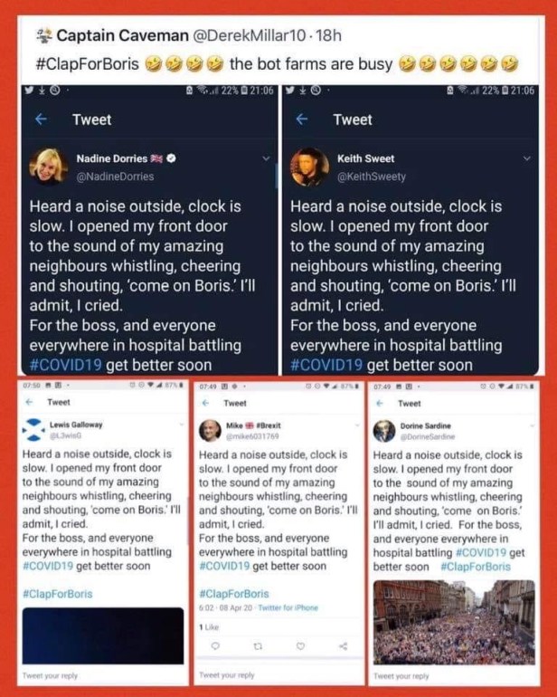 …remember – rather than “quash misinformation” the very strong likelihood is that General Carter’s own Cambridge Analytica trained 77th Brigade PsyOps unit of the British Army are behind the raft of online bot and sock-puppet accounts which are dutifully amplified by #ToryAnalytica’s own incestuous mainstream media, which today platformed a senior military uniform within a Goebbels-esque “uniformity” propaganda picture, that previously pushed the #ClapForBoris rhetoric steeped in a stoic-victimhood, martyr-mentality;