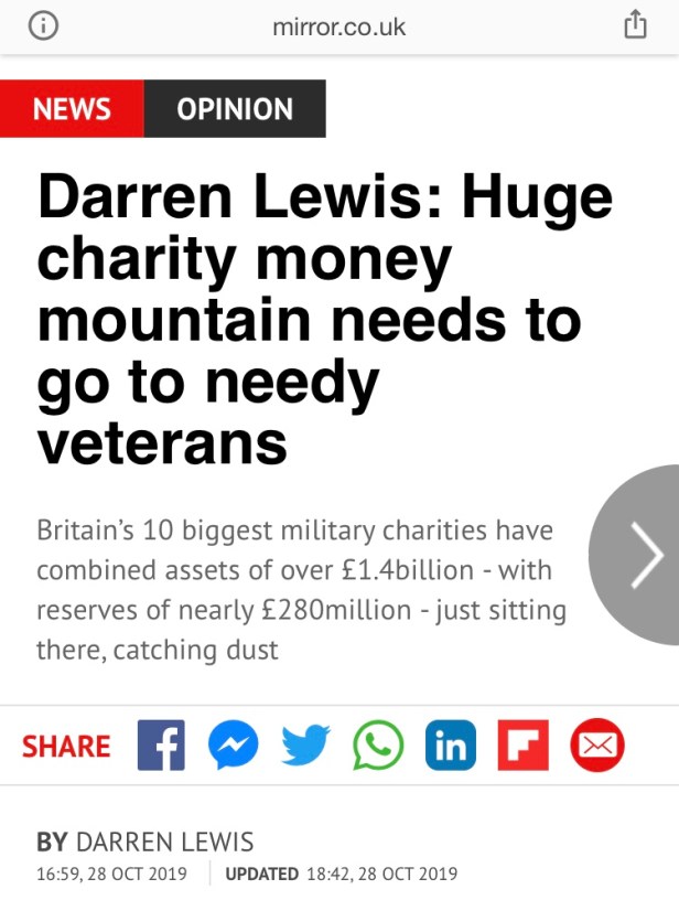 …by fomenting a dual-State ‘superiority-persecution complex’ by media-standardised hypocrisy forever fuelling the far-right and to relentlessly feed fear that permissions the general population to ‘blame’ outsiders; to blame powerless people for homeless ex-soldiers – when as Darren Lewis wrote above, a year ago in October 2019; ‘Britain’s ten biggest military charities have combined assets of £1.4 billion – with reserves of £280 million – just sitting there, catching dust‘.