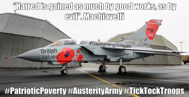 Why? Because the British elite estate knew only too well the predictable emotional-behavioural human condition would step in to fill the deprivation-void – especially just as ‘austerity’ was about to hit – in preparation to ‘organically’ hijack the once-sombre poppy to create recruitment displays; to emotionally entice, compel, and coerce impressionable teenagers into a military uniform and thereby gaslight sustain the State cycle of ‘legitimised’ mass-murder, and…