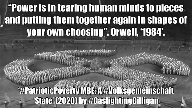 This piece prompted by Marcus Rashford’s charity drive to feed children – to feed children – sets out in detail how Volksgemeinschaft or ‘people’s community’ propaganda works by driving poverty to create predictable emotional-behavioural responses within the human condition…