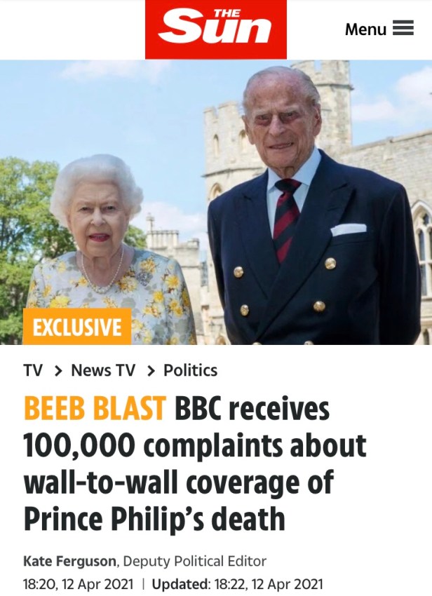 Think about it. The BBC can openly report on their 100,000+ complaints for going OTT on Prince Philip propaganda – but not openly report on the significant number of complaints they must have had for their propaganda omission of the UK Government’s 100,000+ COVID deaths.