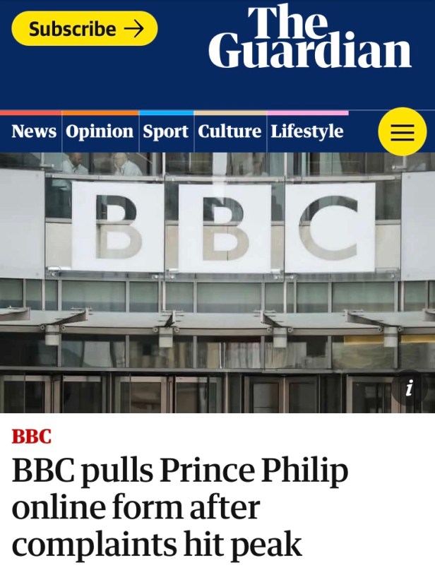 Not only that, but for the BBC – a flagrantly propagandist organisation now outed most recently by its cyclical-propaganda omissions of Tory corruption – to ‘transparently’ announce they then had to ‘pull’ their bespoke ‘HRH RIP’ online complaints form.