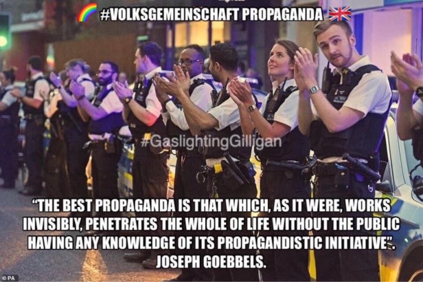 All of which was (is) preparation to gaslight set-up the working poor population by stoically ‘uniting’ us in grief, victimhood and war in order to coerce us into our patriotic Volksgemeinschaft purpose; to go and lose our lives, limbs and minds on foreign battlefields fighting the aristocracy’s cyclically-fictitious ‘enemies’.