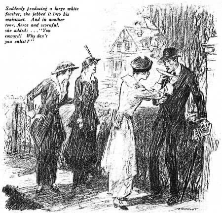 Above: The Imperial Britain precursor playbook to Nazi ‘Rampant Sexism’ whereby Suffragette ‘White Feather Women’ were empowered to directly guilt-shame men of fighting age to ‘volunteer’ themselves for military service; ‘Suddenly producing a large white feather, she jabbed it into his waistcoat. And in another tone, fierce and scornful she added:… “You coward! Why don’t you enlist?”