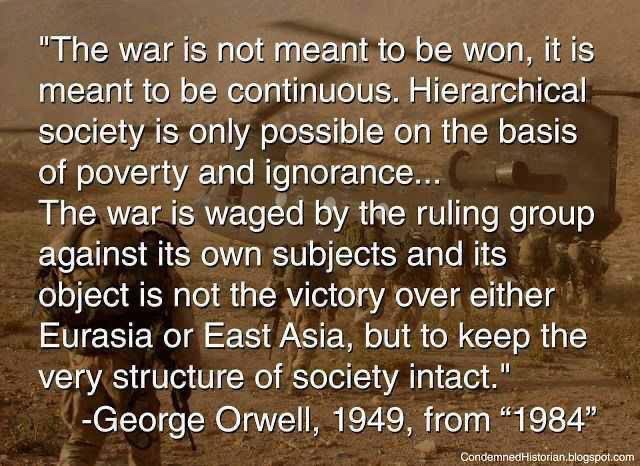 “The war is not meant to be won, it is meant to be continuous. In the long run, hierarchical society was only possible on the basis of poverty and ignorance”. Orwell, ‘1984’.
