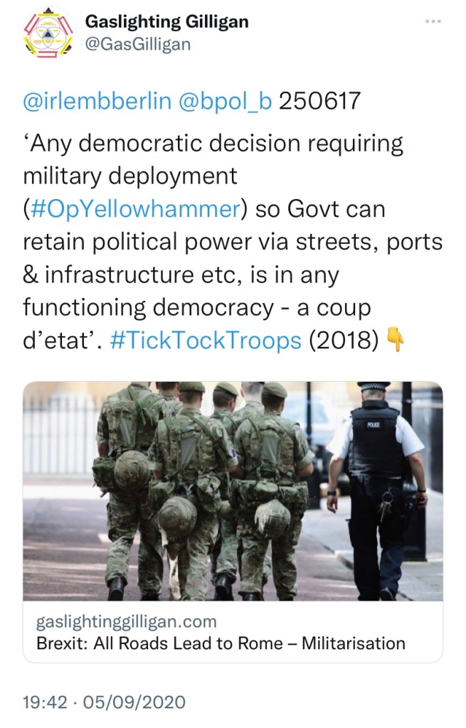 And so to achieve this they therefore need to continue to sprinkle fuel onto the low flickering flame in order that upon their overarching trigger – currently being pursued by Boris Johnson and Co via Ukraine – can engulf the people in the carnage that will ‘justify’ the impending, preplanned ‘#OPYELLOWHAMMER’ militarisation phase. And which with the mainstream media having normalised the prospect of Brexit militarisation for a year, Michael Gove then tentatively attempted to implement it in October 2019 but bottled it – knowing that they’ve only got one chance to get it right.