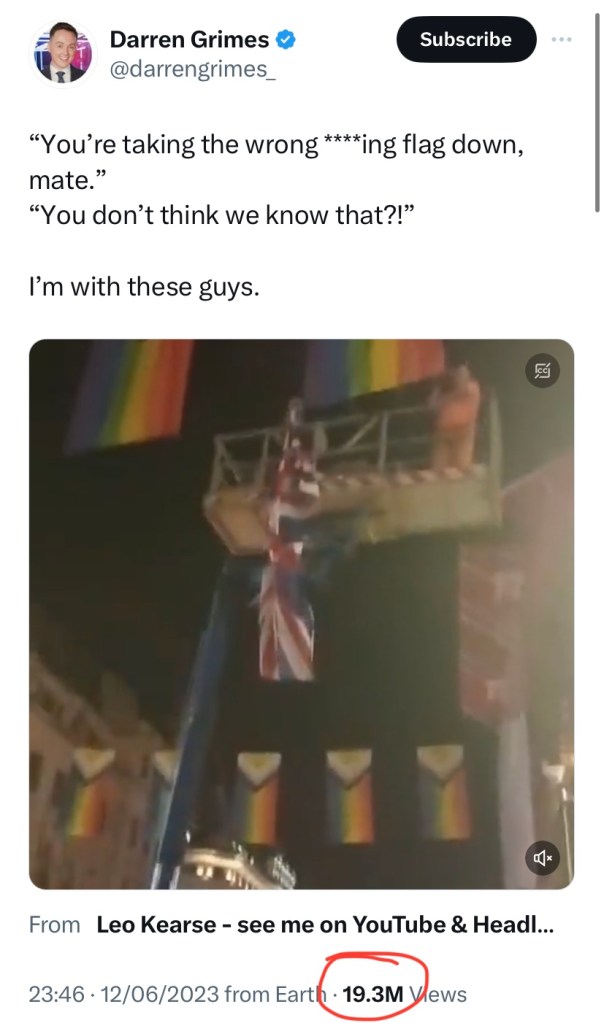 As demonstrated in Darren Grimes tweet amplified by the complicit Twitter platform, utilising both ‘push and pull’ agitation propaganda or ‘Agitprop’, the Orwellian Party’s ‘liberal left’ actually set-up the propaganda spectacles to provide the ‘diversity’ ammunition for their own low-level conventional ‘far-right’ outriders or ‘Pied Piper’s’ such as Grimes, Tommy Robinson and Lawrence Fox, ‘founder’ of The Reclaim Party…