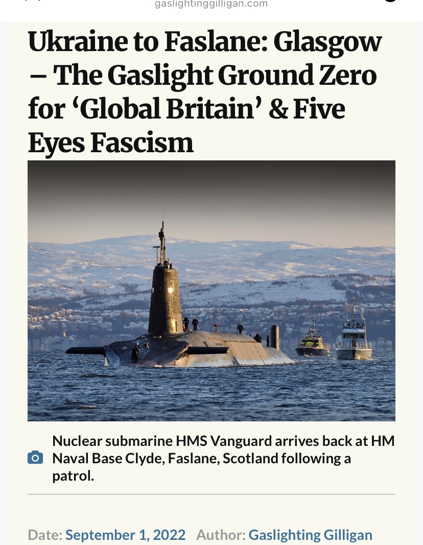 ‘The US/UK cartel collectively need NATO to enter the Ukraine war (any war!) by any and all means at their disposal, to specifically lead to nuclear escalation. Which is why Johnson recently paid a ‘surprise’ visit to the US puppet Zelensky to update his brief and to personally give him his new propaganda material, whilst the media hero-worship both of them to try to align British stoic-victimhood & US/EU public sentiment with the Ukrainian ‘underdogs’ to initiate a US-led global fascism. This ruse is intended to land American troops and multinational private military contractors on mainland Brexit coup Britain – aka Orwell’s ‘Airstrip One’ – who are to be invited at the Tory COBRA Cabinets’ own staged-managed request for US economic and military ‘support’ i.e. another US/UK intelligence led and media fronted coup d’etat’. ‘Ukraine to Faslane: Glasgow – The Gaslight Ground Zero for Global Britain & Five Eyes Fascism’ (2022) https://wp.me/p94Aj4-3j1