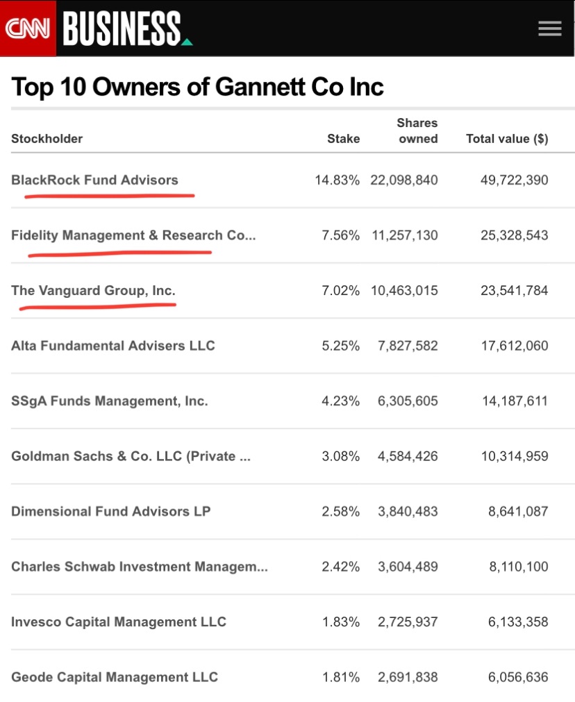 Prior to and during the 2014 referendum not a single daily newspaper in Scotland supported independence. In 2015 ‘The National’ which purports to support independence was also parachuted in to play its ‘Trojan Horse’ role in normalising the US/UK Orwellian agendas from the Scottish ‘left’. This is because it’s owned by UK Newsquest Media Group whose US parent company is Gannett Co Inc whose top three investors as at Aug’23 (below) are heavily involved in the military industrial complex and wealth and ‘health’ management.