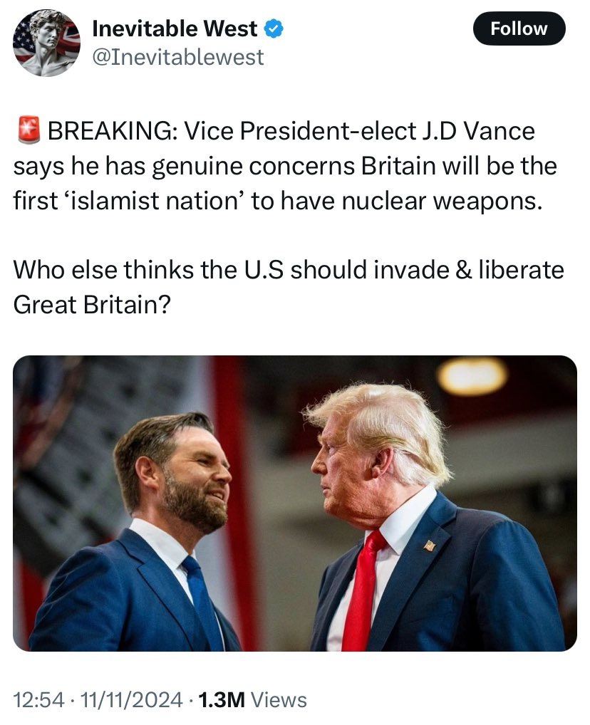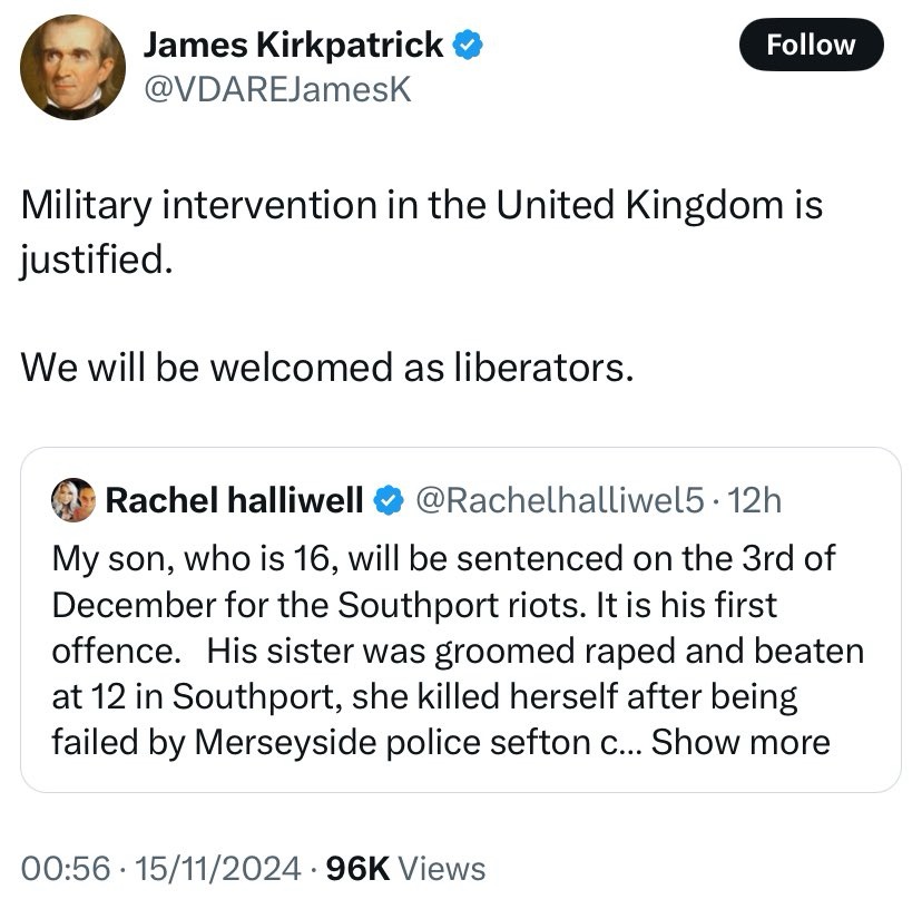 …as can be seen in the ‘inevitability narrative’ also being seeded by US ‘outrider’ or agitprop accounts being force-fed into Twitter/X feeds, which are designed to rile and rally their British fascist allies…