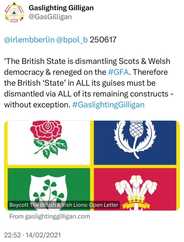 And so it’s this hypocrisy that I’ve been been met with since going public with ‘Gaslighting Gilligan’ (©2017) eight years ago when I began trying to warn people British (& US) led fascism was coming, however ignored by these very same people who claim “rugby and politics shouldn’t mix”, they are themselves part of the reason that British fascism gains more of foothold every day both ‘UK’ domestically and globally.