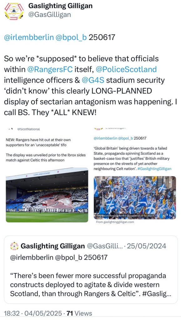 “There’s been fewer more successful propaganda constructs deployed to agitate and divide western Scotland, than through Rangers & Celtic”. ‘Caledon Media: Pro-Scotland Radio with Norrie Hunter’ (2024) https://wp.me/p94Aj4-4yH