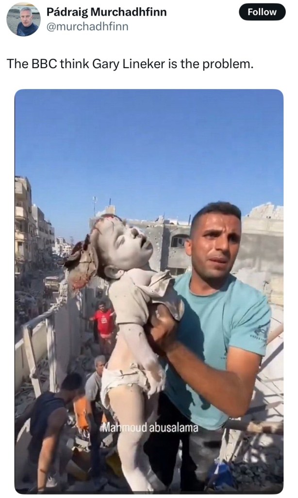 “The *British* Broadcasting Corporation think Gary Lineker is the problem”.