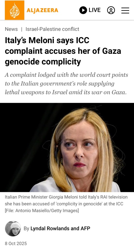 The referral of the ‘right’-wing Meloni this week to the ICC has not been reported in the UK mainstream media. Why? The answer is simple; the British globalist actors and outlets don’t want the ‘UK’ public to twig that the ‘leftist’ Starmer or the politically ‘neutral’ Radakin and many others, are all long overdue being referred, indicted, arrested, investigated and put on trial for genocide.