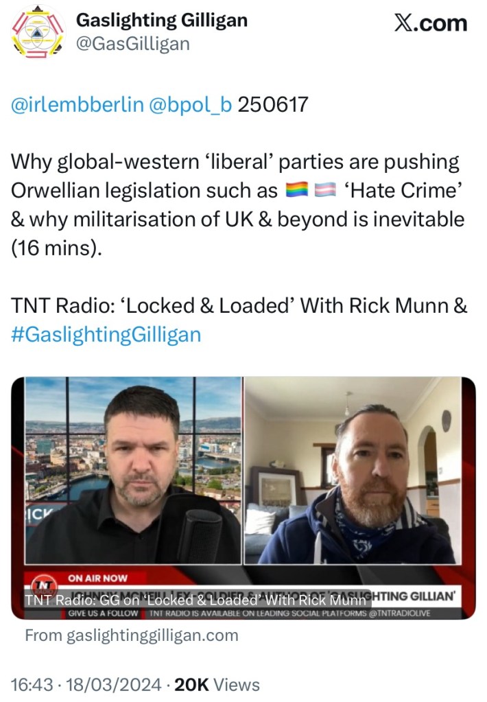 “For the British role in the Gaza genocide, Prime Minister Sunak, Labour’s Keir Starmer and the Head of UK Armed Forces Admiral Radakin – are all as yet untried war criminals”. ‘Gaslighting Gilligan’ (June *2024*)