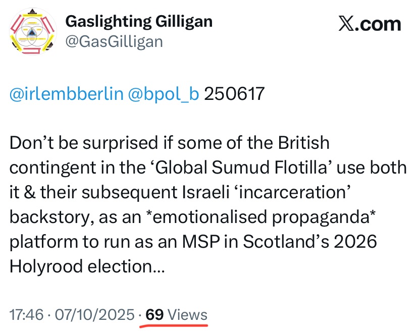 The Gaza Freedom Flotilla has not only been a Machiavellian masterclass in misdirection to bury the actual news of the Meloni war crimes referral to the ICC but is as I strongly suspect, set to become an emotionalised springboard to propel at least one of the British contingent of flotilla actors into Scotland’s Holyrood Parliament next year. (Note below how ‘journalist’ Yvonne Ridley shoehorns the globalist divide and conquer ‘misogyny’ propaganda narrative into the story. Hopefully by calling it out now any such plans will also be scuppered. That stated, people are so slave to their manipulated emotions the Orwellian cartel may well proceed regardless).