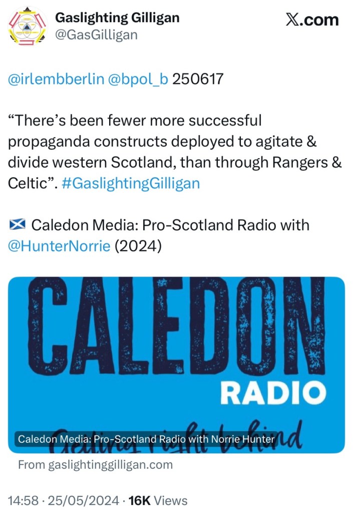 As stated in my standard intro at the top, writing as an ex-soldier, as an independence man and a Rangers supporter, since going public with ‘Gaslighting Gilligan’ on 25th June 2017 via Berlin…