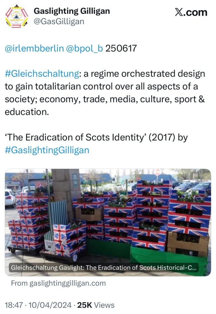 Punch and Judy politics. Orwellian propaganda omissions. Agitator ‘activists’. Our emotionally captured ego’s. The Gleichschaltung erasure of our distinct Scottish historical and cultural identity and the demoralisation of Scotland via sports… ‘Caledon Radio (Ep4): The Volksempfänger Capture of Scotland & Beyond’ (2025) https://wp.me/p94Aj4-54y