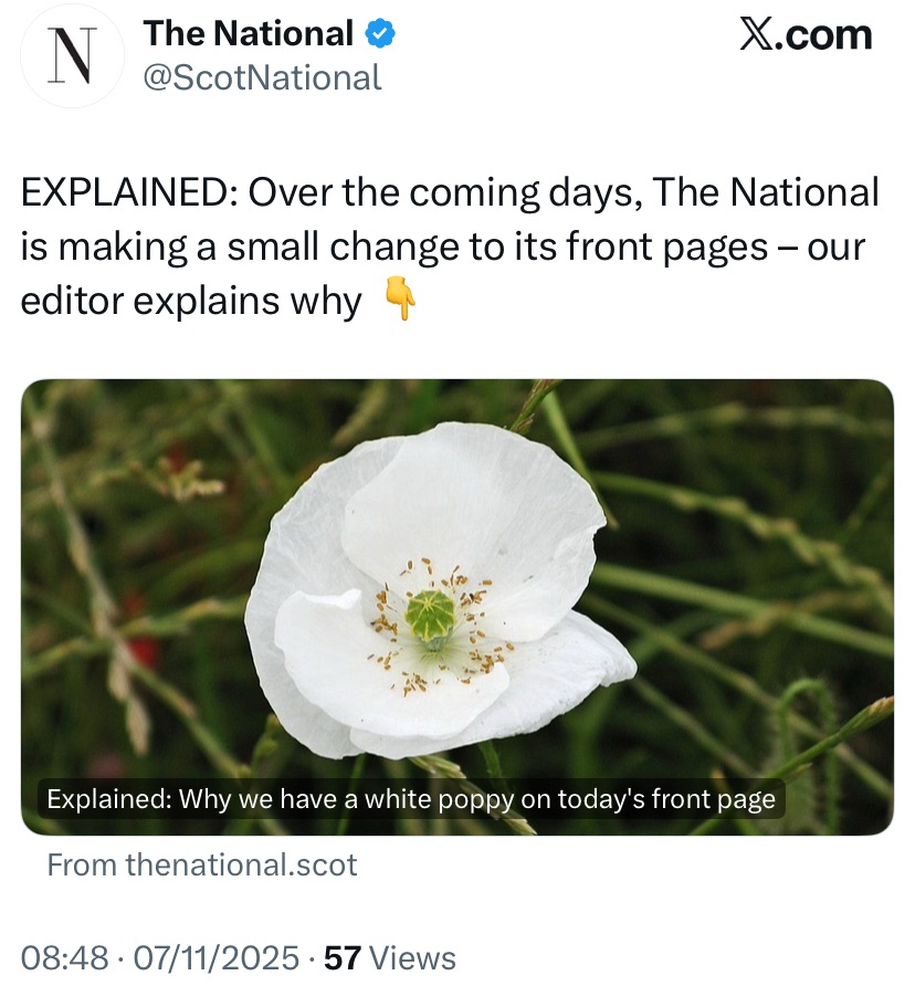 NB – The thumbnail picture of the ‘Veteran’ poppy set against the white poppy is my own improvised version which I’ll be wearing to Murrayfield this weekend. It’s a small gesture and attempt to reconcile the two commemorative meanings – rather than do what The National has attempted today (above) with ‘their’ piece, as do the wider legacy media and online agitprop actors – indeed “history’s actors” – on both and all sides…