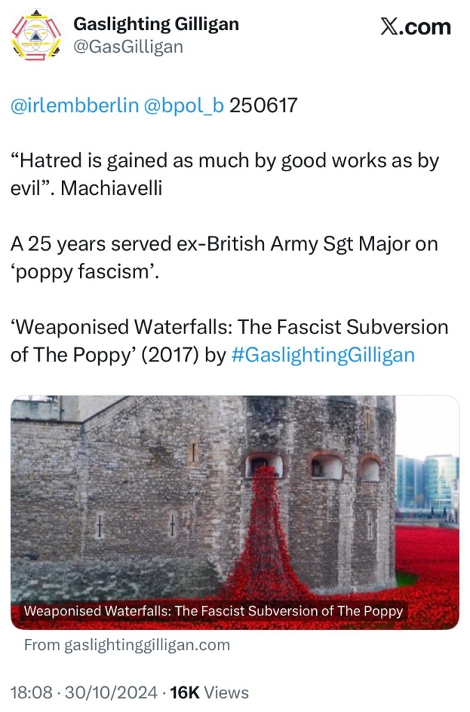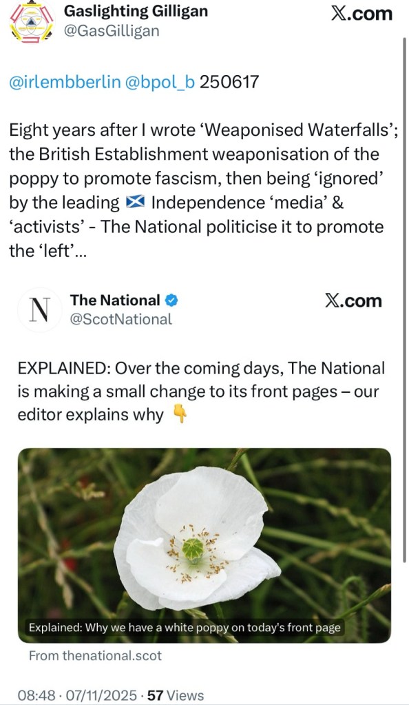 Employing keywords and using its greater reach to flood social media in combination with the X and Facebook algorithm suppression of my accounts, The National and its ‘journalists’ are again ‘mimicking’ my work to draw traffic readership away to prevent wider understanding of not only how the poppy was weaponised by the British Establishment to begin recruiting a new generation youth…