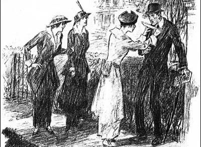 Suffragette ‘White Feather Women’ propaganda depiction reads; ‘Suddenly producing a large white feather, she jabbed it into his waistcoat. And in another tone, fierce and scornful she added:.. “You coward! Why don’t you enlist?” (See ‘The White Feather Girls: Women’s Militarism in the UK’