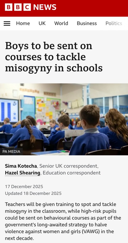 Hence why instead, men and boys will continue to be be manipulated and driven into female, societal and therefore State subservience via the orchestrated and contrived media and political male demonisation and dehumanisation campaign ‘Violence Against Women & Girls’ narrative which propaganda-paints western societies as mass ‘misogynist’ hell-holes, where all men and boys are portrayed as potential sex-pests and rapists who can only cease to be a ‘threat’ to women and girls if they allow themselves to coerced by ‘push and pull’ social engineering, to pour their austerity-skint patriotic purpose into a ‘heroic’ military uniform where they can recover their sense of pride, self-esteem and society’s respect…
